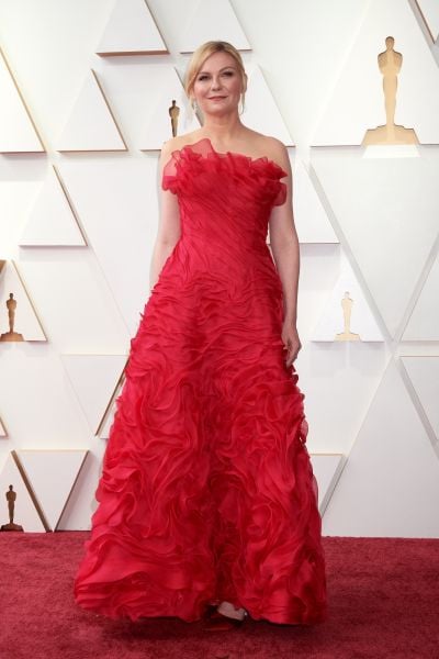 Nomeada para a premiação com O Ataque dos Cães, Kirsten Dunst foi ao Oscar com um vestido vermelho vintage da Lacroix.