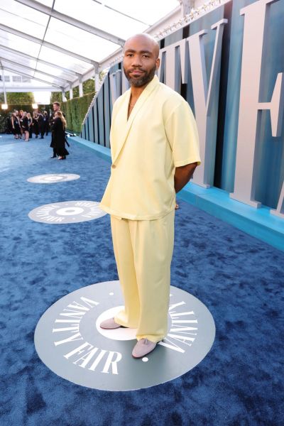 Marcando presença na festa pós-Oscar da Vanity Fair, o ator Donald Glover usou King & Tuckfield em um look amarelo candy e monocromático.