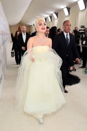 Com um colar da Tiffany&Co., graças ao colo de fora, Lady Gaga compareceu ao Elton John Aids Foundation Academy Awards com um vestido da Rodarte.