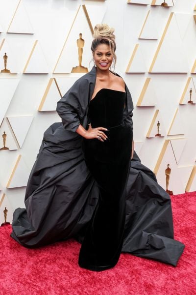 Laverne Cox, com muita classe, veste um custom de August Getty Atelier. Os recortes assimétricos no colo e quadril deixam o vestido preto nada básico.