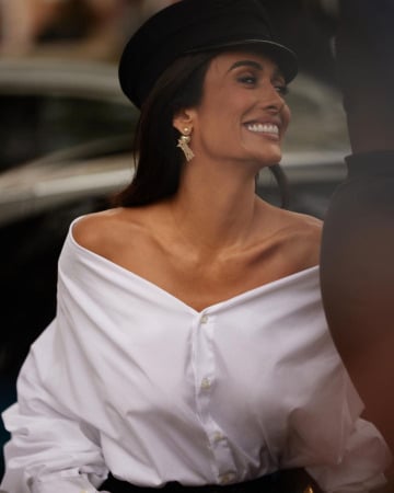 A comunicadora usou um cap de marinheiro em lã e aba de vinil preto. No corpo, alfaiataria impecável com calça super acinturada com um cinto fino no mesmo tom e, a peça chave, uma camisa branca de algodão com corte assimétrico.