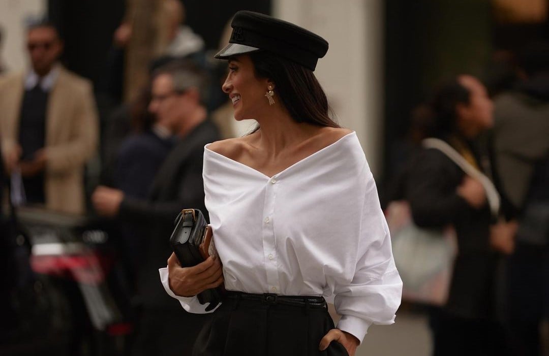 A comunicadora usou um cap de marinheiro em lã e aba de vinil preto. No corpo, alfaiataria impecável com calça super acinturada com um cinto fino no mesmo tom e, a peça chave, uma camisa branca de algodão com corte assimétrico.