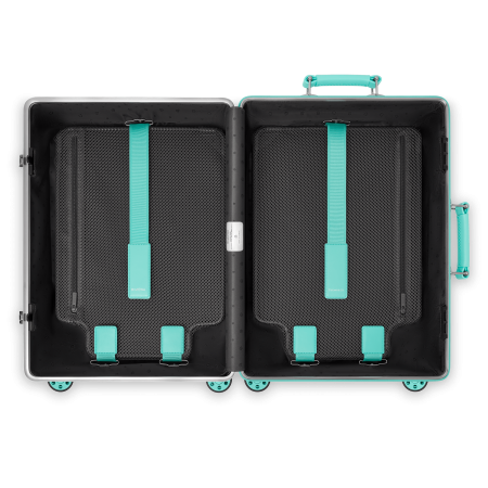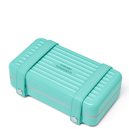 O policarbonato característico da RIMOWA assume inteiramente a cor Tiffany Blue® na criação da nova coleção RIMOWA x Tiffany & Co. Jewelry Personal. Adotando uma nova função, o interior da bolsa – que está harmoniosamente com a tonalidade distinta – apresenta seis compartimentos para jóias para guardar os seus pertences mais preciosos durante as viagens. O seu exterior apresenta os logotipos da RIMOWA e da Tiffany & Co. no centro, inscritos entre duas tiras de couro Tiffany Blue.