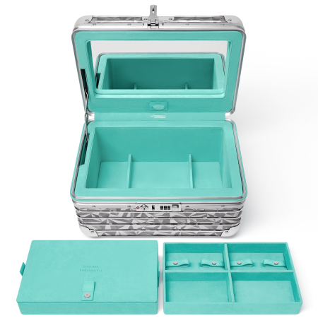 A nova Jewelry Case apresenta a icônica tonalidade Tiffany Blue® em todo o seu interior, na pega e na vedação. Feita para proteger jóias preciosas em casa ou durante viagens, a case tem três níveis. Abrindo a partir do topo para um acesso fácil, os viajantes encontrarão primeiro um grande espelho com uma placa de prata por baixo que pode ser gravada. O estojo abre-se para um tabuleiro selado no topo com cinco compartimentos para guardar anéis e outras jóias. Com argolas em couro especialmente criadas, o tabuleiro do meio foi concebido para guardar colares e pulseiras, enquanto o tabuleiro inferior apresenta três grandes espaços concebidos para guardar peças preciosas.