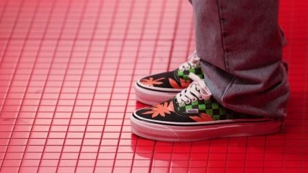 Xadrez verde e preto com palmeiras vermelhas: uma fusão de cores vibrantes que remetem ao espírito californiano da Vans.