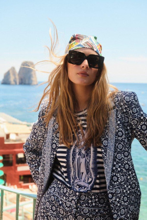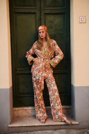 O floral azul é uma das apostas mais sofisticadas da coleção. “O azul combina elegância e modernidade, sendo extremamente versátil,” afirma Carol. As estampas florais nessa tonalidade são perfeitas para eventos formais ou para o ambiente de trabalho, com opções de peças estruturadas. “Gosto muito do azul para criar looks monocromáticos, que podem ser facilmente compostos por blazer, camisa de manga curta e calça. Uma dica extra? Acrescente um lenço estampado na cabeça!”.