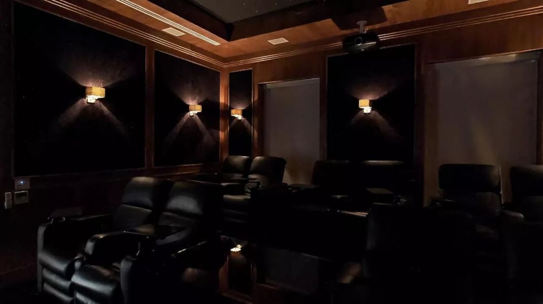 As duas suítes máster ficam no último andar e possuem grandes closets e banheiros espaçosos. No lugar destinado à piscina, optou-se por fechar e criar um cinema de última geração com dez poltronas e equipamentos profissionais de som, imagem e iluminação.