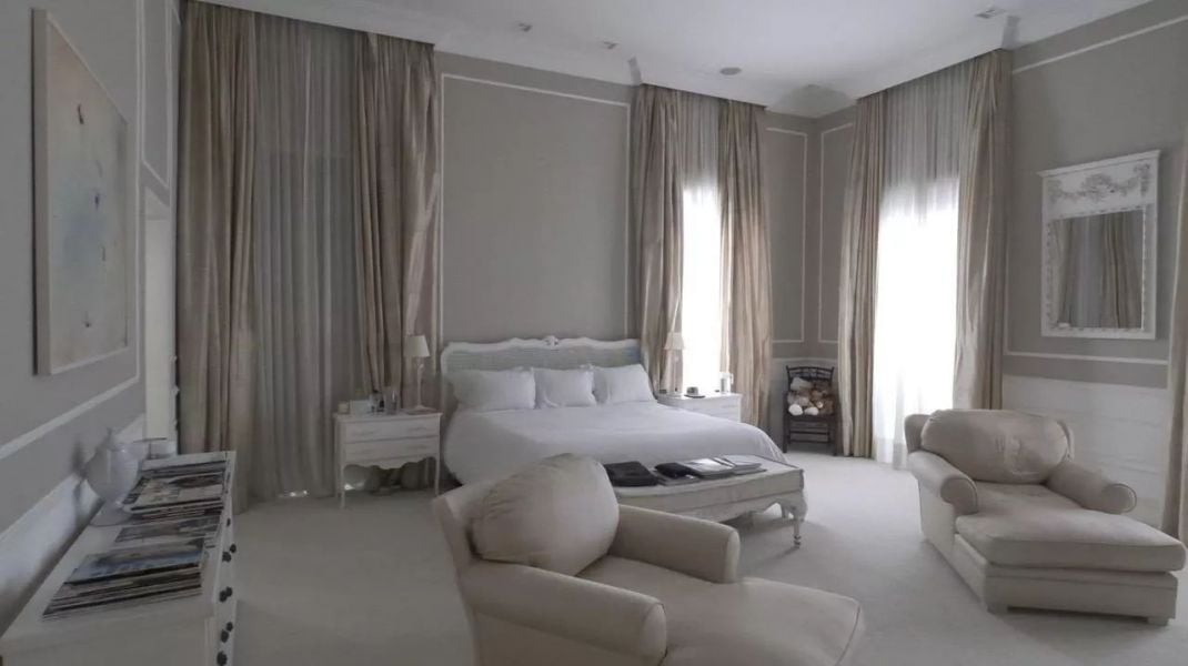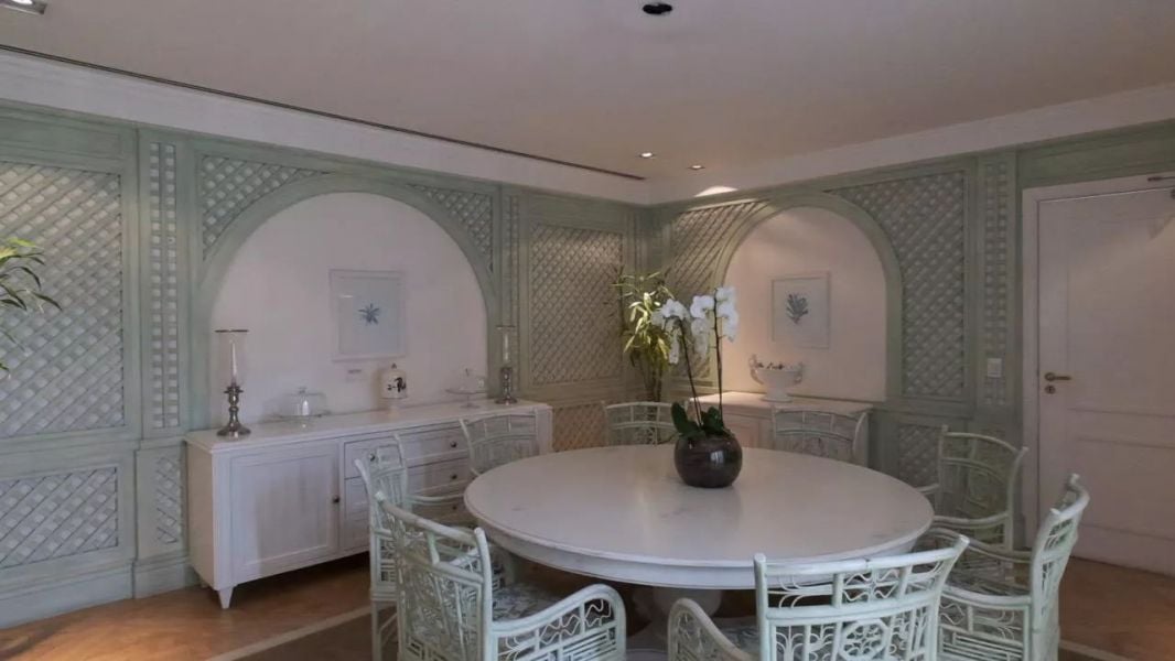 No primeiro andar, está localizado o lobby, o living principal composto por diversos ambientes, sala de jantar, sala de almoço, home theater, cozinha e dependência completa de serviço. No segundo pavimento, há outra cozinha de apoio, também com área para funcionários, cinco suítes, um estúdio de música profissional e sala de jogos.