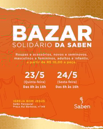 A Saben (Sociedade Árabe de Beneficência) promove nos dias 23 e 24 de maio mais uma edição do tradicional Bazar Solidário da Saben, no salão paroquial da Igreja Bom Jesus, em Curitiba (PR).