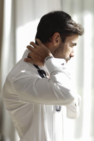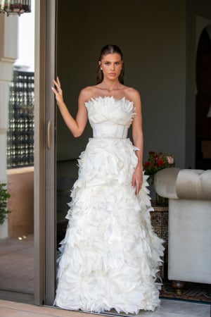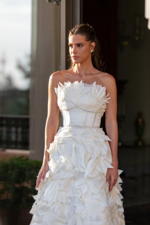 Empresária e amante da moda, Stephanie Garcia escolheu um vestido de silhueta única idealizado pelo estilista paulistano Júnior Santaella. Para completar o look, sapatos da Corello desenhados exclusivamente para esta ocasião. As joias de família fizeram com que Tét, como é carinhosamente chamada pelos amigos, brilhasse em meio ao deserto.