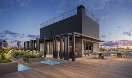 No rooftop, a vista da cidade será de tirar o fôlego. À disposição, uma sala de reuniões para 14 pessoas, espaço gourmet, fireplace, espelho d’água, produção de energia solar, pista de minigolfe e mesa de ping pong.