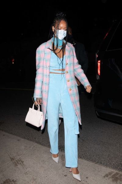 Vestindo rosa bebê e azul da cabeça aos pés, Rihanna declarou a chegada da primavera e das cores pastel. Vestindo um casaco xadrez sobre um co-ord azul bebê, a mega estrela complementou seu look de jantar com sapatos creme pontudos e uma bolsa rosa clara.