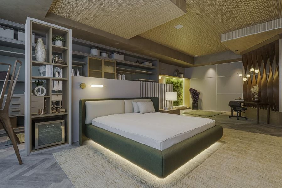 A Cama Origem, da Reveev Colchões, foi lançada na Mostra Artefacto Paraná. O produto tem design assinado pelo arquiteto Felipe de Medeiros e pela designer Susane Raiter. Ela fica no ambiente da arquiteta Viviane Bush.